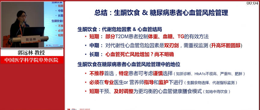 中国医学科学院阜外医院郭远林教授对生酮饮食在糖尿病心血管风险管理中的作用进行了系统评估。郭教授首先指出,生酮饮食作为一种极低碳水化合物饮食模式,近年来在糖尿病管理中受到广泛关注。短期研究显示,生酮饮食可显著改善体重、腰围及甘油三酯水平,但这些获益的持续性仍需进一步验证。
