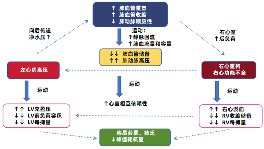早期HFpEF的特征是心脏重塑较少和左室压力轻度受损,仅在运动期间左室充盈压升高。随着时间的推移,左心房功能和重构进行性恶化,导致继发性二尖瓣反流和阵发性房颤,在此阶段可能会出现静息时左心室充盈压轻度升高。