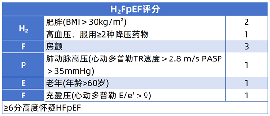 H₂FPEF评估是否存在高血压、BMI>30 kg/m²、房颤、肺动脉高压、老年人(>60岁)和左室充盈压升高。