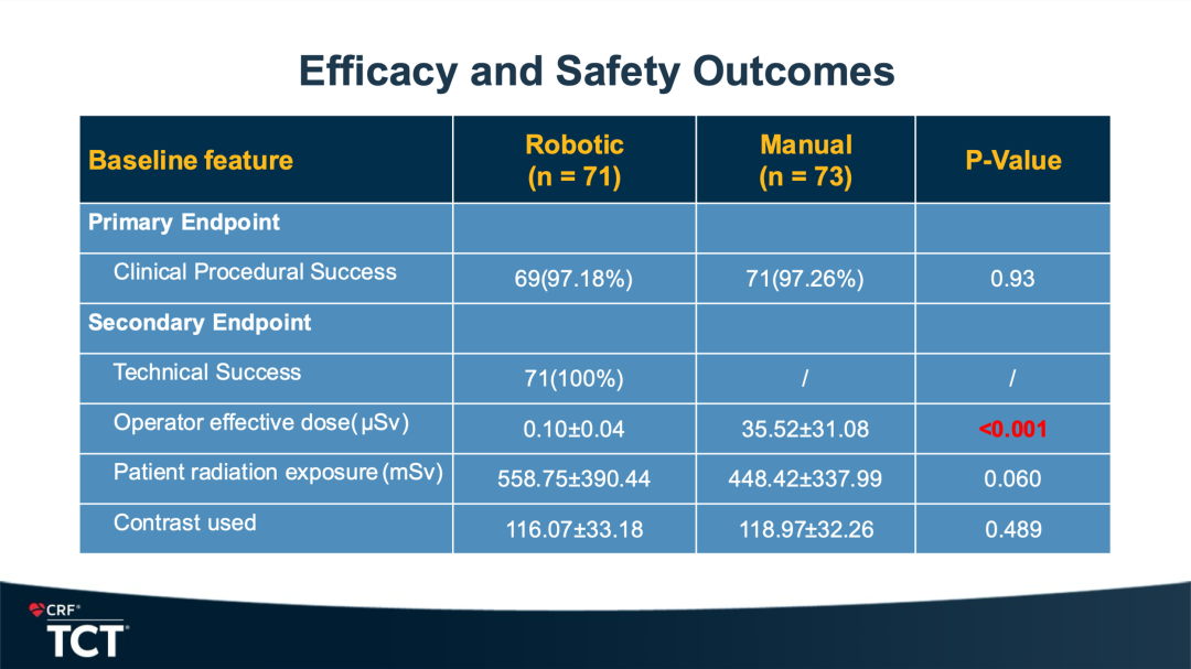 安全有效性的结果:临床成功率,机器人组97.18%;机器人技术成功100%,无转人工,无器械缺陷。在主要操作者辐射保护方面,效果突出,降低97.2%的医源辐射。在患者辐射及造影剂用量上,两组无显著差异。