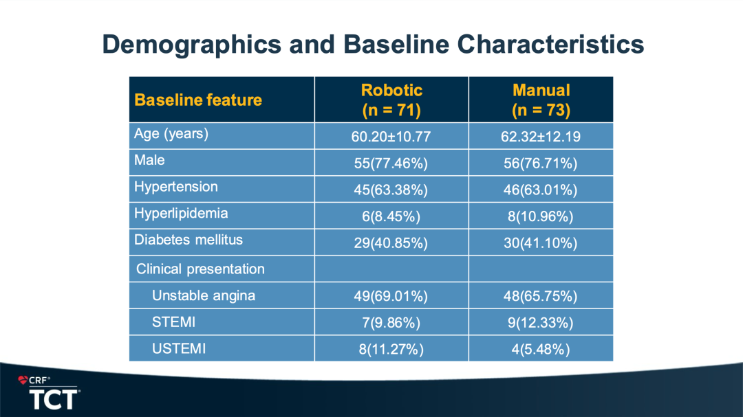 机器人组71例,传统手术组73例,两组患者在年龄、性别、基础疾病(高血压,高脂血症,糖尿病)和入院时的临床诊断等方面无显著差异。