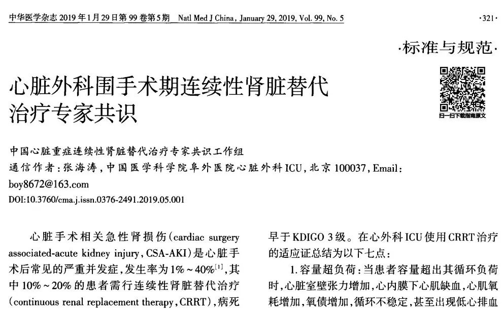 CRRT的是连续性肾脏替代治疗(continuous renal replacement therapy,CRRT),是指一组体外血液净化的治疗技术,是所有连续、缓慢清除水分和溶质治疗方式的总称。传统CRRT应持续治疗24h以上,但临床上可根据患者的治疗需求灵活调整治疗时间。近年来CRRT治疗目的不仅仅局限于替代功能受损的肾脏,更扩展到常见危重疾病的急救,成为各种危重病救治中最重要的支持治疗措施之一。