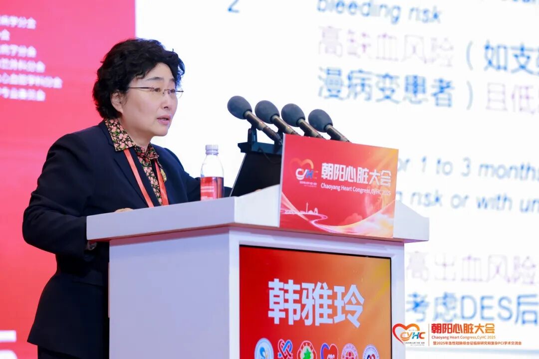 韩雅玲教授以“欧美指南抗血小板治疗和抗凝治疗策略变迁中的中国证据”为主题,从欧美指南抗血小板治疗策略变迁中的中国证据、欧美指南抗凝治疗策略变迁中的中国证据两个维度,系统梳理了冠心病抗栓治疗获益与风险的实践变化趋势。详细介绍了中国医生在稳定冠心病缩短 DAPT(双联抗血小板治疗)疗程、早期 P2Y12 抑制剂单药治疗、冠心病长期抗栓治疗胃肠道损伤防治、比伐芦定优化抗凝策略创新等方面的探索成果,并分享了自己团队在新临床背景下对新问题的思考与实践,为临床精准抗栓治疗提供了重要参考。