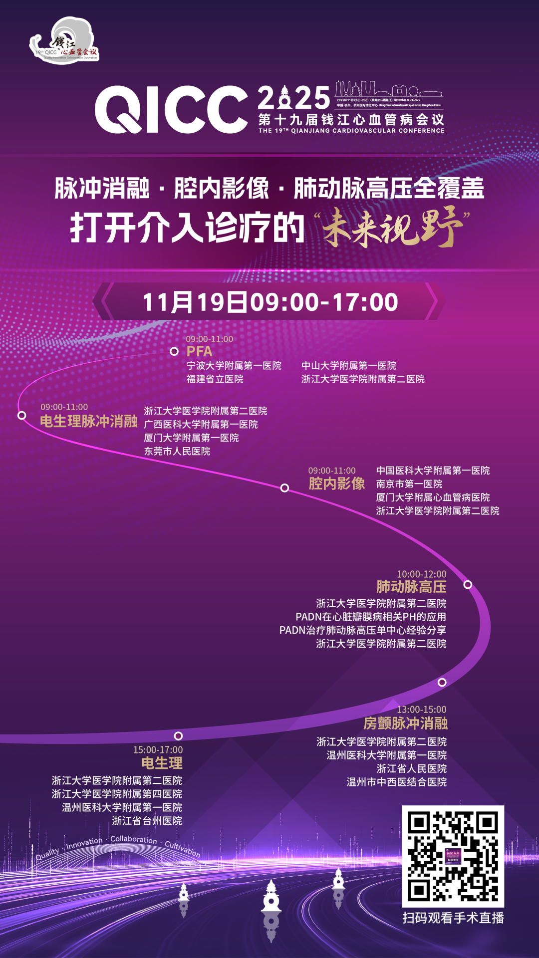 2025年11月20日-23日,第十九届钱江心血管病会议(QICC 2025)将于杭州国际博览中心拉开帷幕。除丰富多元的线下议程外,大会特设的「线上手术直播频道」将于11月18日至19日率先拉开帷幕,提前点燃学术热潮。来自全国多家高水平中心的术者团队将携手登场,连续两天呈现30余台高质量手术演示,以“云术台”的形式带来更具临场感的实战分享与技术交流。