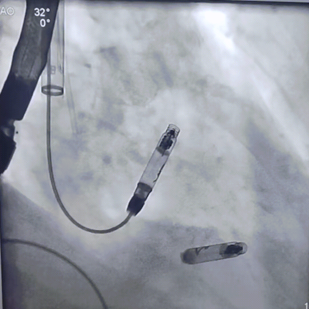· 术后放射学成像显示,AVEIR™ VR成功植入室间隔,AVEIR™ AR成功植入右心耳基底部(图4);