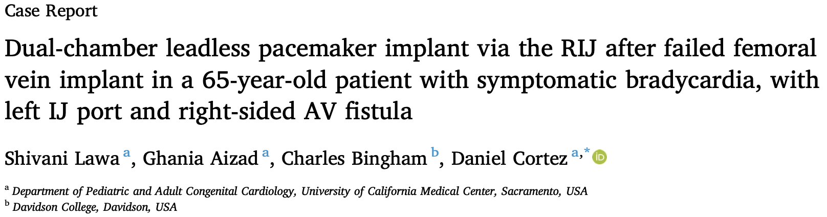 Lawa, Shivani, Charlie Bingham, and Daniel Cortez. "Dual-chamber leadless pacemaker implant via the RIJ after failed femoral vein implant in a 65-year-old patient with symptomatic bradycardia, with left IJ port and right-sided AV fistula." Indian Pacing and Electrophysiology Journal (2025).