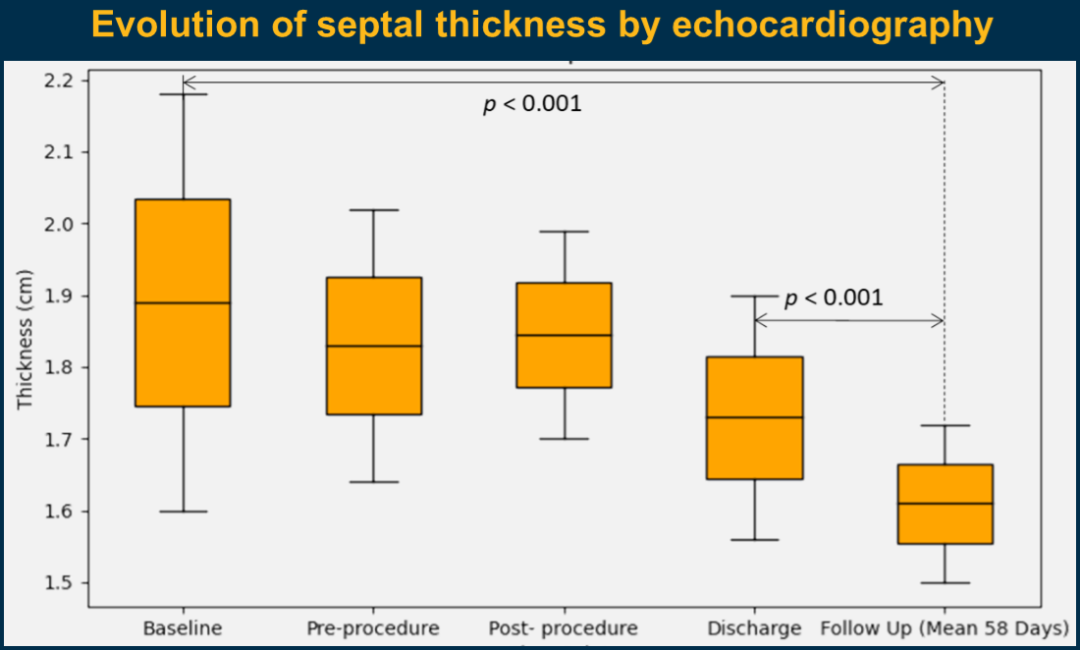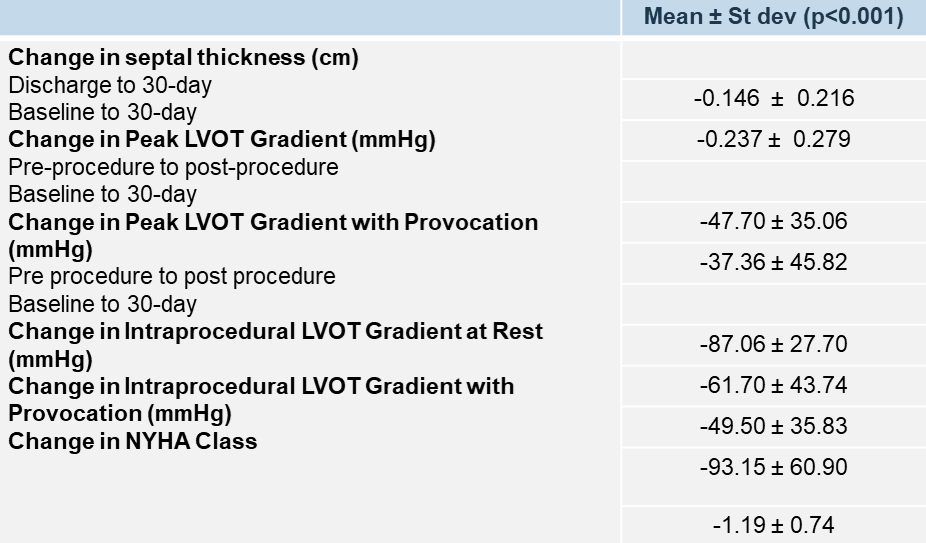 长期随访变化:从基线到术后30天,激发状态下LVOT峰值压差平均减少61.70±43.74mmHg(p<0.001),静息状态下峰值压差平均减少37.36±45.82mmHg(p<0.001)。