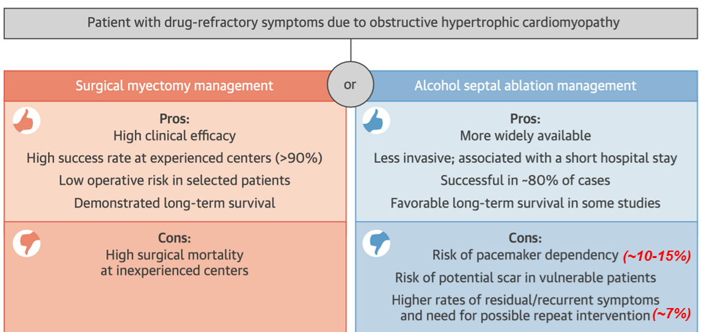 ASA作为一种经皮介入治疗,以其微创性、住院时间短等优势,成为无法耐受手术患者的重要选择,临床成功率约80%。但ASA的技术特性也带来了独特风险:通过向间隔支动脉注射酒精造成心肌梗死,以达到缩减室间隔厚度的目的,这种非精准的梗死方式可能导致梗死面积过大,引发严重并发症。研究显示,ASA术后起搏器依赖风险约7%,部分患者可能因室间隔疤痕形成导致心律失常,且残留或复发性梗阻的发生率相对较高,部分患者需要接受二次干预。正如Sorajja P在《JACC》的研究中所警示的,尽管技术不断进步,ASA的并发症风险仍无法完全规避,临床应用中需要在疗效与安全性之间寻求平衡。