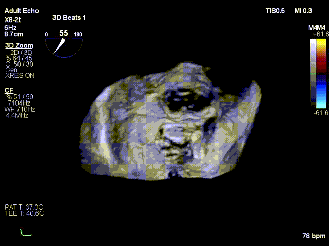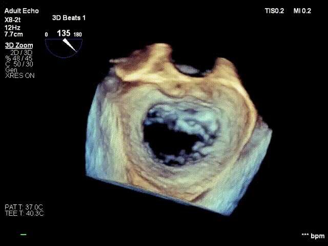 1. 术前三尖瓣超声评估:三尖瓣关闭不全重度(4+平均缩流颈9.5mm),反流口位于前隔、中央、后隔,瓣环轻度扩张(平均瓣环径42.8mm),瓣叶增粗稍增厚退行性样改变。