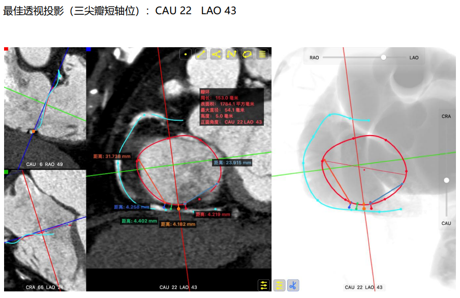 2. 术前三尖瓣CT评估:CT收缩期时影像质量不佳,舒张期时三尖瓣瓣环呈椭圆形。收缩期舒张期瓣环周长面积相差不大。右冠脉走形偏房侧 ,RCA收缩期冠脉与后瓣环距离均>3.0mm,术中冠脉影响风险较低。