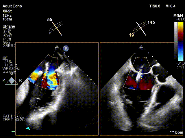 术中鄢华院长团队宋丹主任、郭卉主任与超声科余正春教授经充分沟通及分析,决定术中采用拉链式策略,先在2区偏3区植入1枚短宽二尖瓣夹,术中房间隔穿刺高度:4.2cm,于2区偏3区置入一枚短宽瓣膜降低瓣叶张力、减少撕裂风险,夹闭后瓣叶张力可、夹子L侧仍残余反流2-3+。于是再于2偏1区置入第二枚短宽瓣膜夹,夹闭后反流降至轻度,跨瓣压差1mmHg,肺静脉逆流消失。