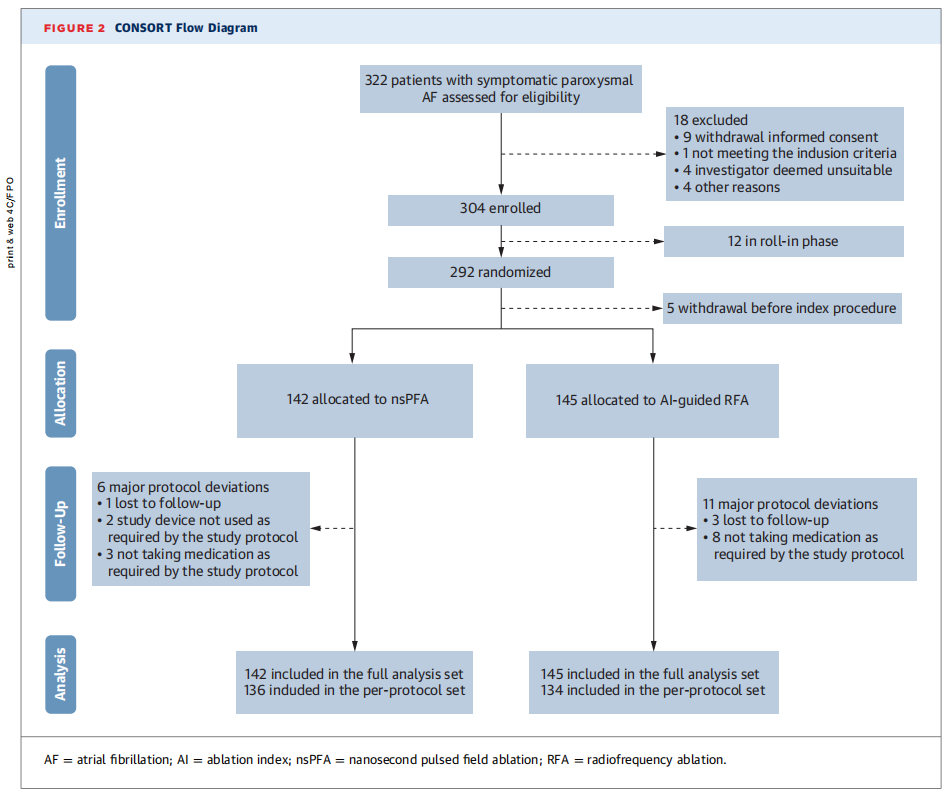 纳入18-75岁、有症状的阵发性AF患者。经过筛选,最终287例患者接受消融治疗,其中nsPFA组142例,AI量化消融指数指导的RFA组145例,两组患者基线特征无显著差异。