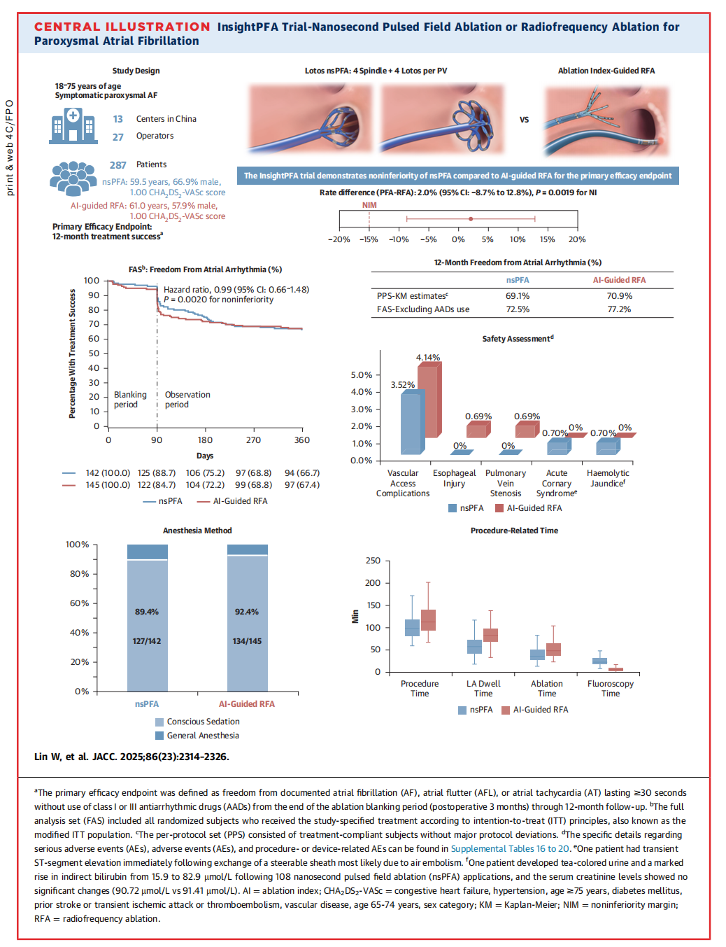 由广东省人民医院心内科薛玉梅教授团队牵头的全球首个采用纳秒脉冲技术的RCT多中心临床实验InsightPFA研究正式发表于国际心血管领域顶刊《美国心脏病学会杂志》(JACC)。此次InsightPFA的研究成功登刊,不仅填补了纳秒脉冲电场消融(nsPFA)与传统射频消融头对头对比研究的部分空白,更标志着我国在房颤介入治疗技术领域的研究水平已跻身国际前列,为中国科研力量在全球舞台上赢得了重要话语权。