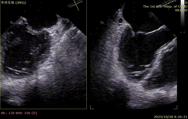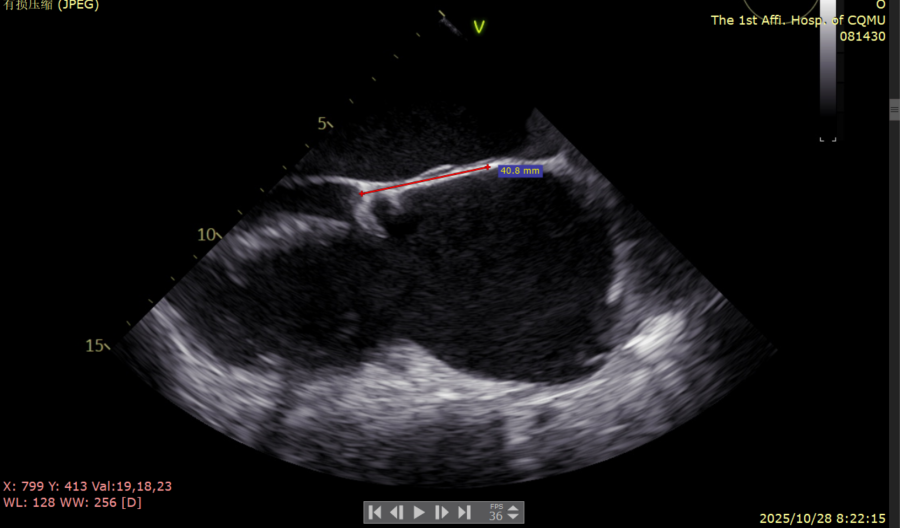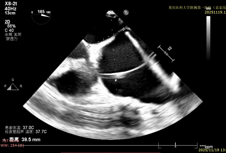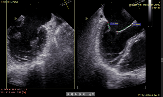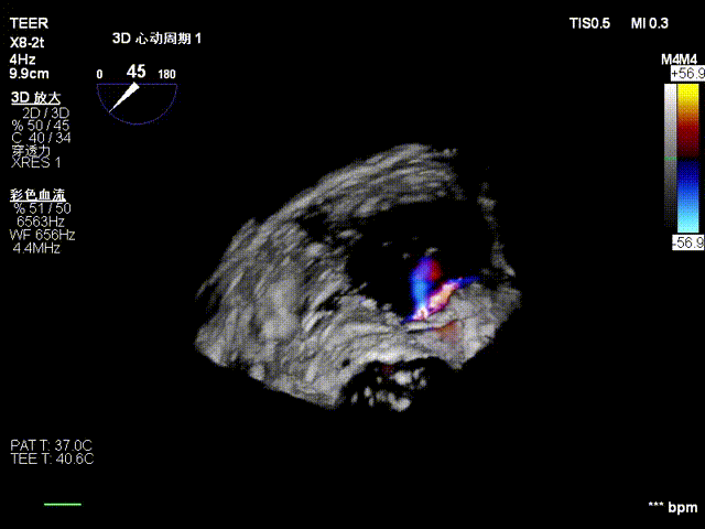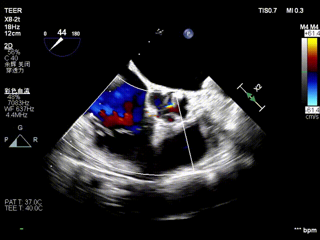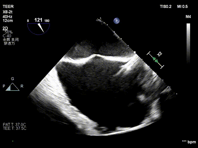 复查TTE及TEE检查进一步评估二尖瓣情况。明确为FMR( Carpentier Ⅲb型),二尖瓣后叶栓系,2区瓣叶运动(视频2),重度FMR(4+), 肺静脉逆向血流;2区后叶长度1.15cm,2区前叶长度2.46cm,AP径3.2cm,瓣口面积5.1cm²,房间隔高度3.95cm,瓣叶无钙化,二尖瓣瓣膜条件适合行TEER手术。