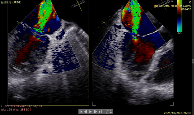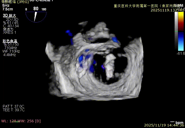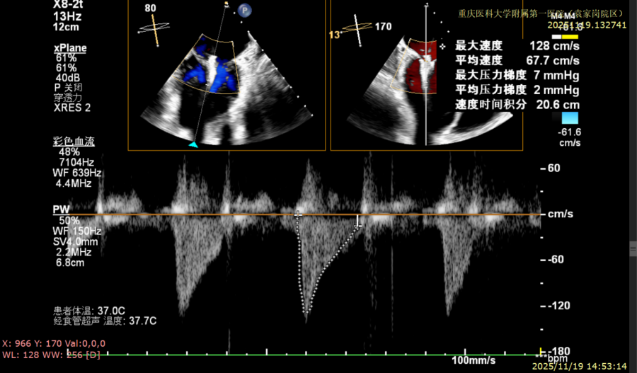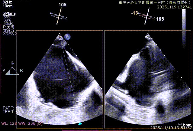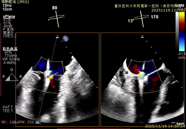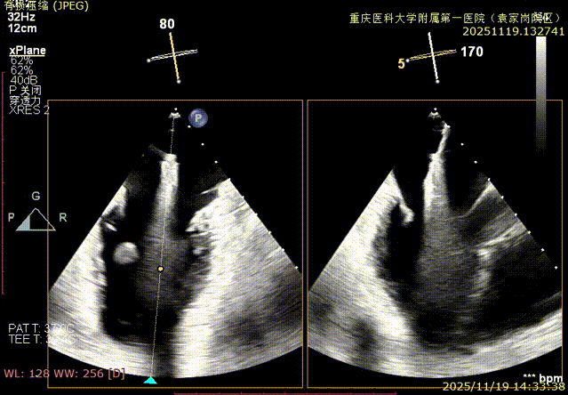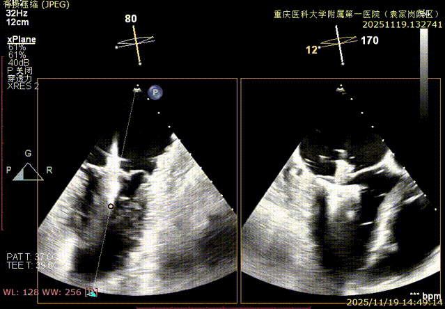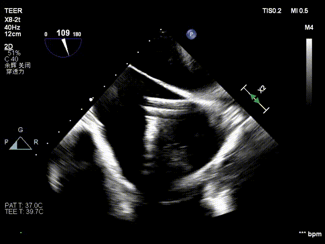 患者全麻下行TEER手术。向睿副主任团队穿刺患者右侧股静脉,在X线及食道超声指导下完成房间隔穿刺(视频4)成功获得3.95cm穿刺高度(图4)。再将加硬导丝送至左上肺静脉,20F股静脉扩张鞘充分扩张股静脉穿刺部位,沿加硬导丝将可操纵导引导管(SGC)送入左房。延SGC送入XTR夹子完成骑跨,使用M旋钮使夹子指向二尖瓣(图5)(视频5)。调整Mitraclip输送系统顺利到达二尖瓣目标位置,TEE指导下左房内完成弹道测试和Orientation调整(视频6)。缓慢将XTR夹子送入左室,并三维再次确认夹子轴向和反流位置,缓慢上提夹子使夹臂成功捕获瓣叶(视频7),Gripper Down夹持前后瓣叶并缓慢关闭夹臂(视频9),夹持后反流降至微量(视频10),二尖瓣平均跨瓣压差2mmHg(图6)。评估后将夹子释放。释放后反流微量夹子稳定。术后复查超声证实夹合组织充分,显示微量残余分流。术后二尖瓣平均跨瓣压差2mmHg,肺静脉多普勒波形恢复正常。手术时间持续约1.5小时。