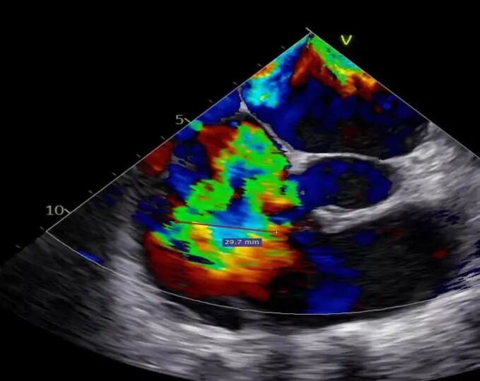 入院后超声诊断:二尖瓣重度反流(4+);三尖瓣重度反流;心力衰竭;左房、右心增大。