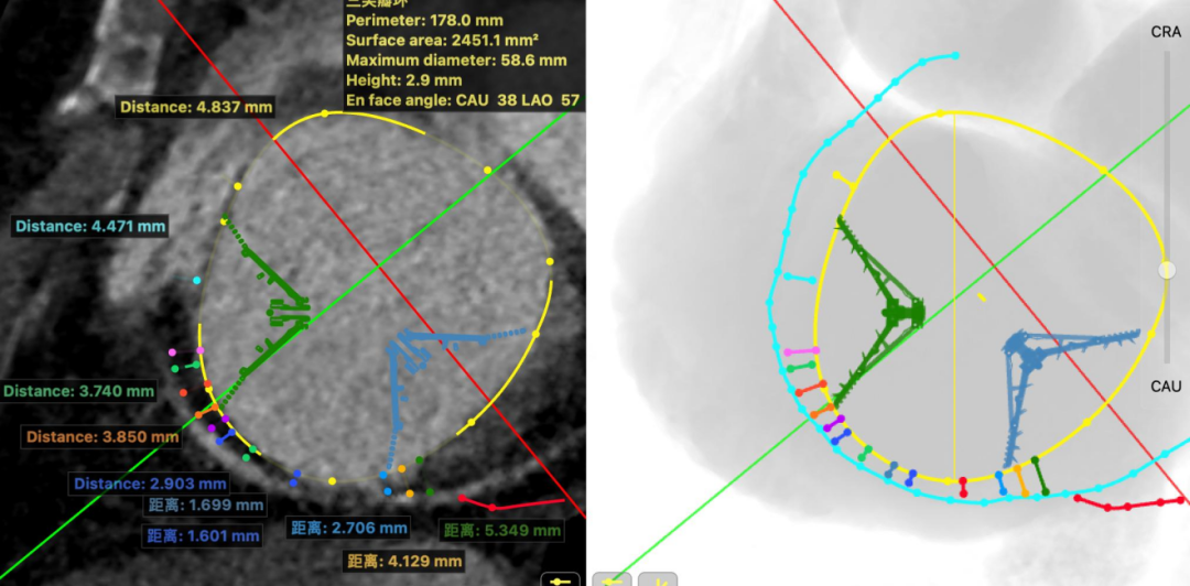 术前CT评估:三尖瓣周长17.8cm,面积24.5cm²,隔侧径56mm,前后径57mm,收缩期测量冠脉最近1.6mm。右冠偏心房侧。