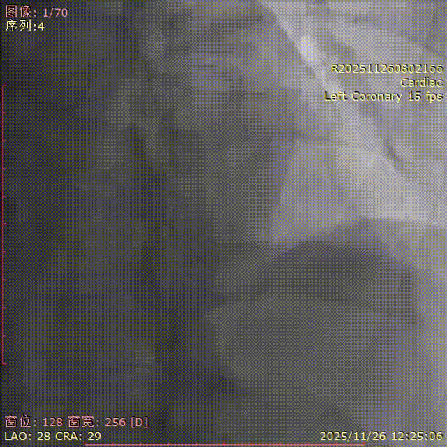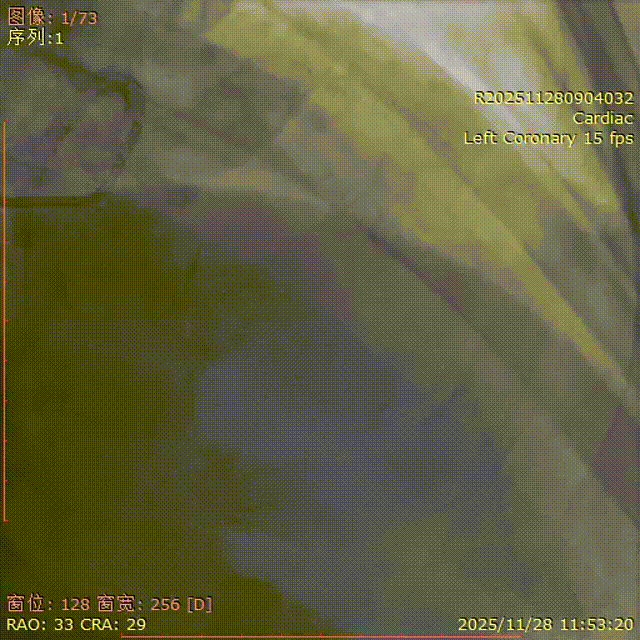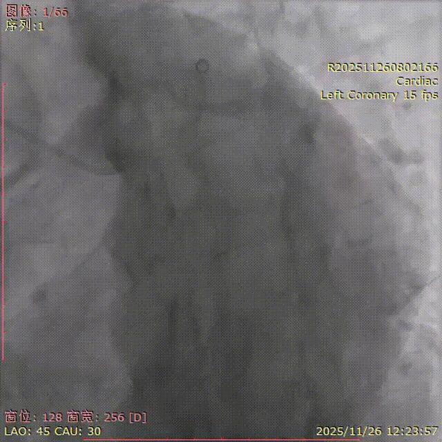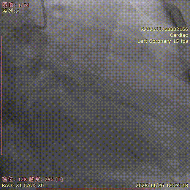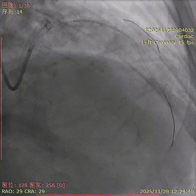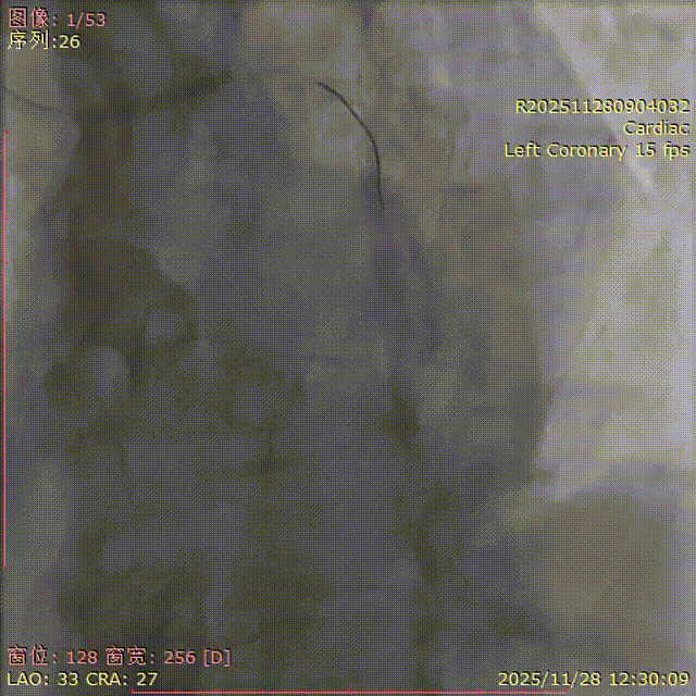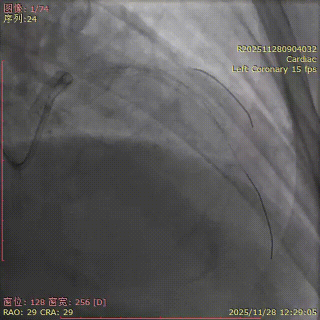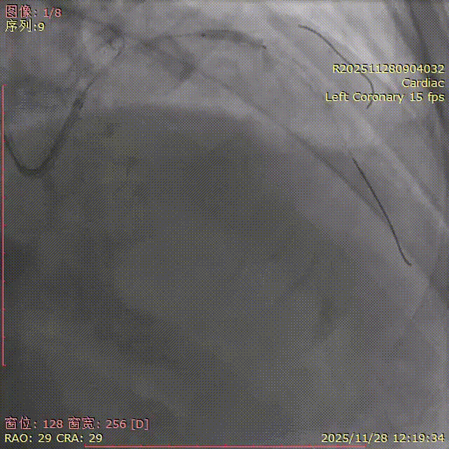 72岁,男性。患者于2025年11月26日行冠脉造影检查示:前降支近段可见约60%节段性狭窄,中段支架完全闭塞,D1开口可见约85%局限性狭窄,可见自身少许侧枝至前降支远段,回旋支近中段可见约50%节段性狭窄,原支架通畅,可见少许内膜增生。行IVUS检查提示前降支重度狭窄,重度钙化。与患者及家属沟通后同意介入治疗前降支,导入切割球囊、后扩球囊扩张病变,支架近段见狗骨头现象,反复修饰支架狗骨头现象不能消除,故原支架置入2.75*30mm药物球囊扩张病变,重复造影提示近段局部可见少许A型夹层,前向血流3级。本次为进一步处理前降支病变入院。