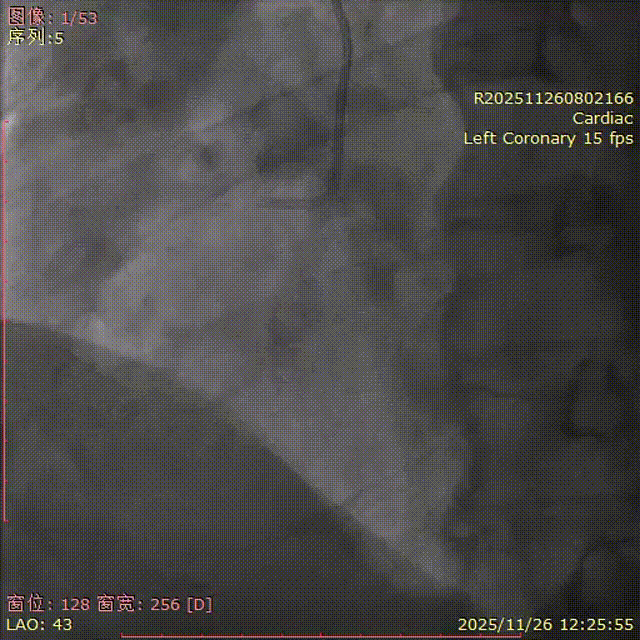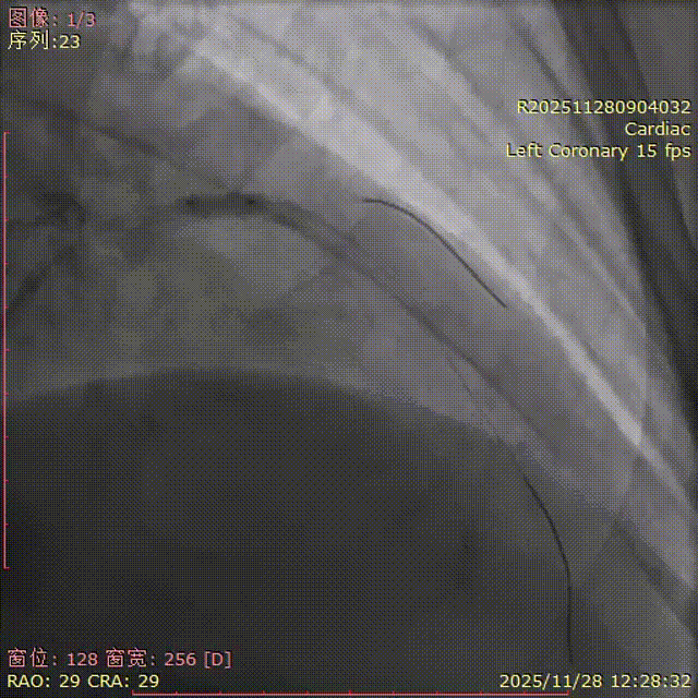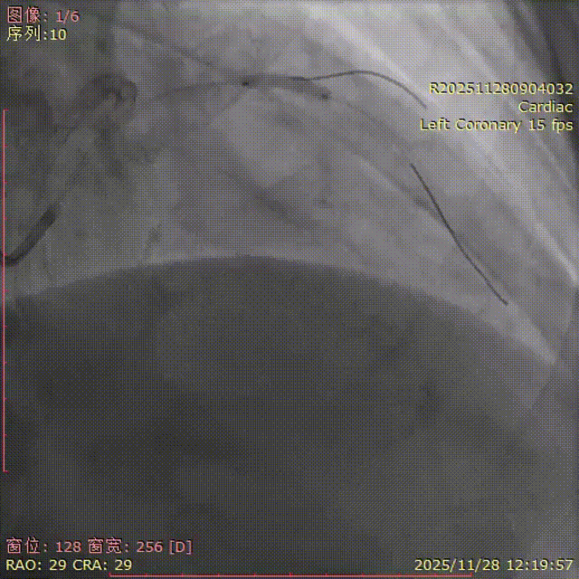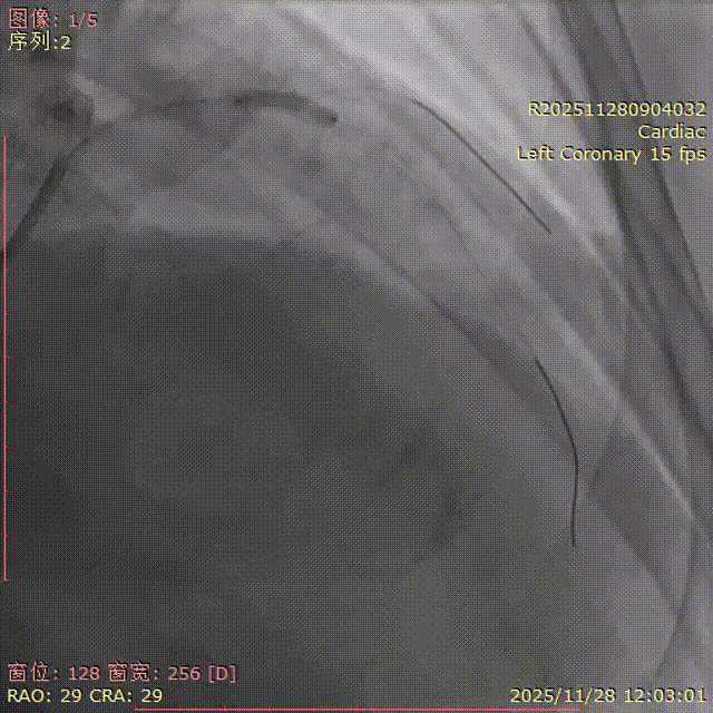 患者因前降支重度狭窄伴重度钙化于11月26日首次介入治疗,术中虽予切割球囊及高压后扩球囊处理,但效果欠佳。本次治疗经与家属充分沟通后,选用TomaHawk®血管内冲击波系统,采用声压力波有针对性地作用于冠状动脉内膜及中膜下的钙化病灶,在不影响血管内膜完整性的情况下,有效地震松或震裂钙化病灶,恢复血管顺应性,显著改善前次支架膨胀不良现象,为后续支架的植入提供更理想的管腔。