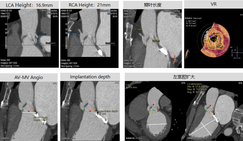 左室腔扩大,EF较低,有一定循环崩溃风险,主动脉瓣环水平夹角52.7度,非横位心患者,主动脉弓宽度、角度可;二尖瓣机械瓣(横列式)置换术后AV-MV夹角130度,距离主动脉瓣虚拟瓣环6.67mm。