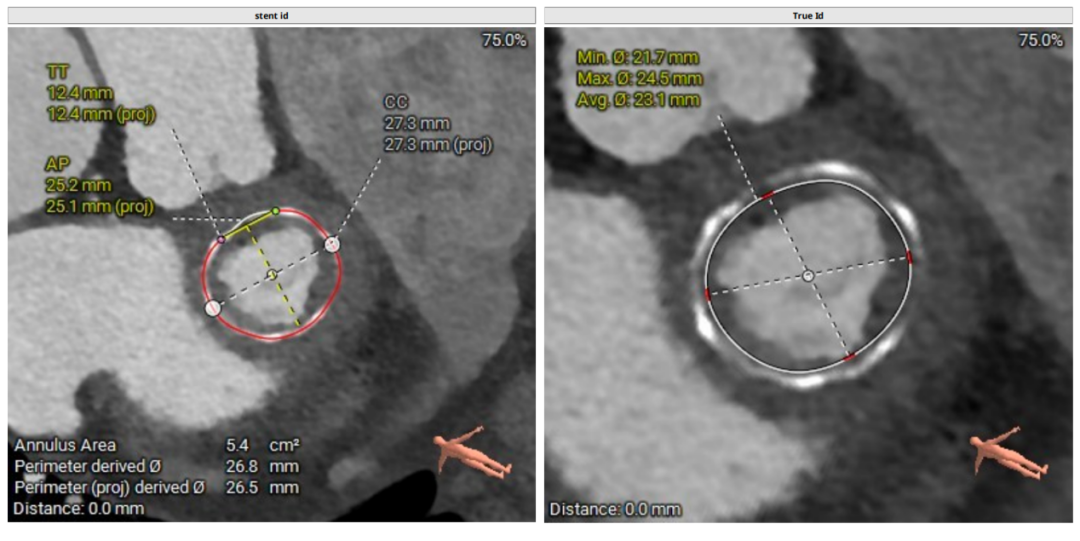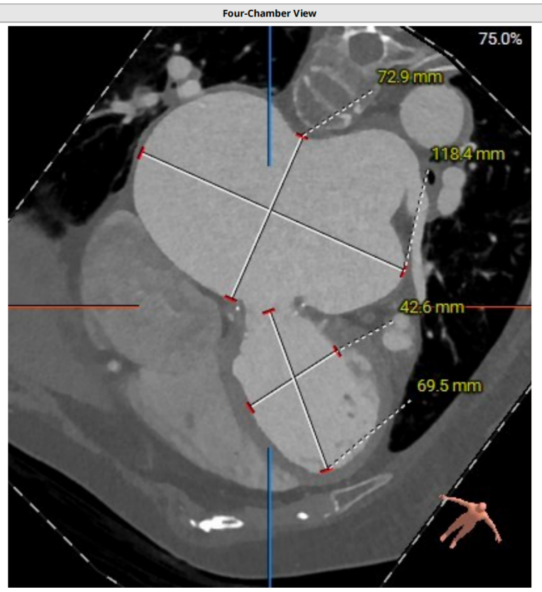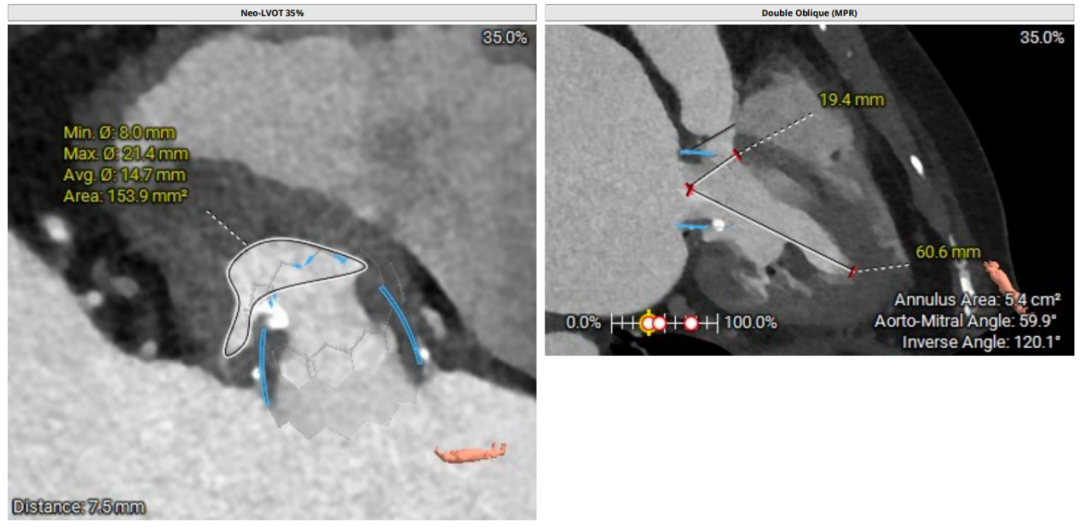 二尖瓣生物瓣支架内径 26.5mm,结合瓣架形态、瓣架高度及手术记录,符合EPIC 27#。瓣中瓣治疗考虑选择25# 介入瓣膜。模拟25# 瓣膜植入,测得NEO-LVOT 面积155.8mm²,术后存在新流出道梗阻风险。左心耳尖端未见血栓。左心房增大73.4*118.7mm,房间隔未见增厚,未见明显钙化,靠后靠下房间隔穿刺点距二尖瓣水平高度27.7mm,房间隔穿刺点高度可。