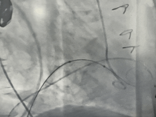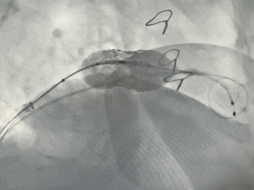 在经食道超声心动图(TEE)及X线透视引导下,使用SWARTZ鞘及房间隔穿刺针于卵圆窝后方成功穿刺房间隔。