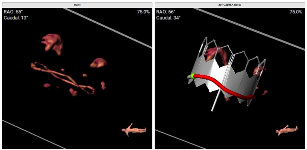 将25#球囊扩张式瓣膜输送系统沿加硬导丝送至二尖瓣环位置。在TEE及DSA多角度共同确认下,精确定位。在RVP下,快速充盈球囊,将新瓣膜成功释放并固定于原生物瓣环内。即刻TEE及造影评估显示:人工瓣膜位置良好,功能正常,未见瓣周漏,左室流出道通畅。