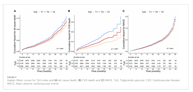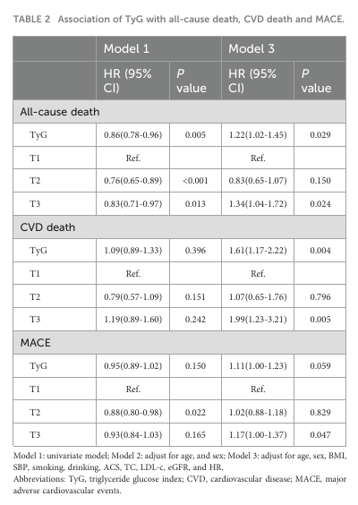 多因素Cox回归分析结果(经过对年龄、性别、BMI、收缩压、吸烟、饮酒、ACS、总胆固醇、低密度脂蛋白胆固醇、估算肾小球滤过率、心率等混杂因素进行调整后)表明,TyG指数作为连续变量是全因死亡和CVD死亡的独立危险因素(风险比[HR]分别为1.22和1.61)。与T1组相比,T3组发生全因死亡、CVD死亡和MACE的风险分别增加了1.34倍、1.99倍和1.17倍。(表2)