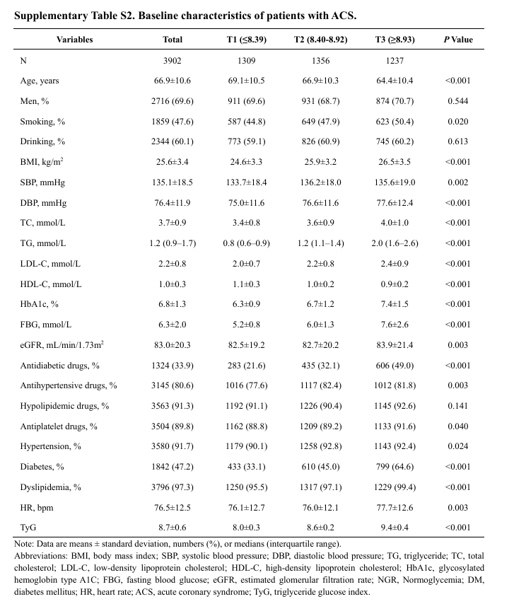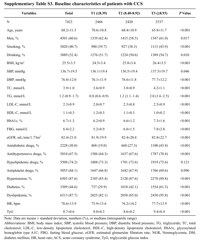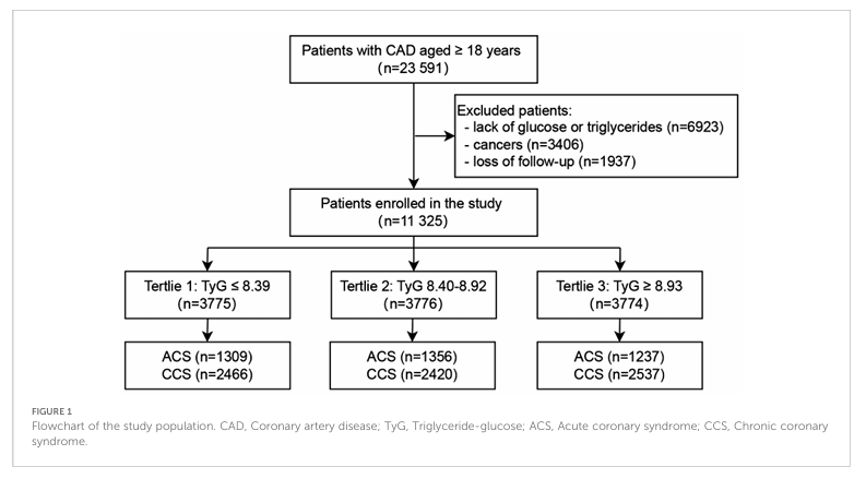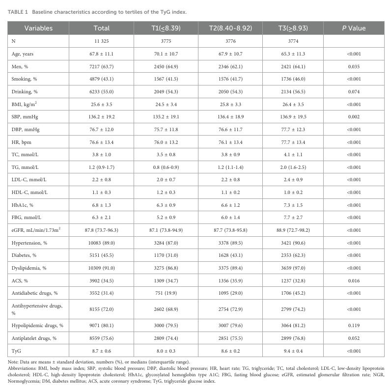 研究于2016年1月至2021年12月期间进行,共纳入了23591例确诊为CAD的患者。根据预先设定的排除标准:(1) 缺失血糖或甘油三酯数据(n=6,923);(2) 确诊癌症(n=3,406);(3) 失访(n=1,937)。最终有11325例患者被纳入最终分析。TyG指数的计算公式为:TyG = Ln [空腹甘油三酯(mg/dL) × 空腹血糖(mg/dL) / 2]。研究人员根据TyG指数的三分位数将所有参与者分为三组:T1组(TyG ≤ 8.39, n=3775)、T2组(8.40 ≤ TyG ≤ 8.92, n=3776)、T3组(TyG ≥ 8.93, n=3774)。(图1)