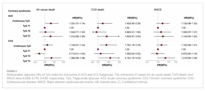 亚组分析进一步揭示了TyG指数在CAD不同亚型中的独特预测价值。在ACS患者中,连续TyG指数与全因死亡风险的增加显著相关(HR=1.33)。而在CCS患者中,连续TyG指数则与CVD死亡风险的增加显著相关(HR=1.79)。更值得注意的是,在CCS患者中,T3组相较于T1组,CVD死亡风险增加了2.15倍。(图4)