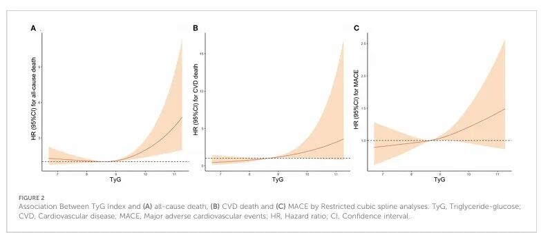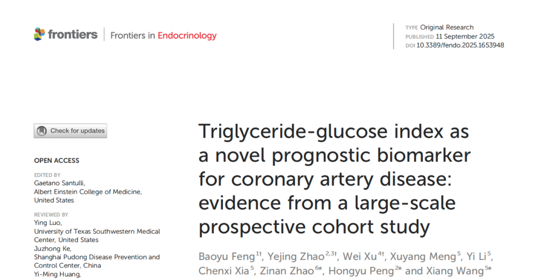 来源:Feng B#, Zhao Y#, Xu W#, Meng X, Li Y, Xia C, Zhao Z, Peng H*, Wang X*. Triglyceride-glucose index as a novel prognostic biomarker for coronary artery disease: evidence from a large-scale prospective cohort study. Front Endocrinol (Lausanne). 2025 Sep 11;16:1653948. doi: 10.3389/fendo.2025.1653948. PMID: 41019316; PMCID: PMC12460115.