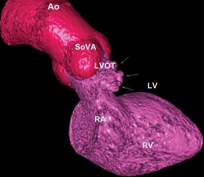 AO(主动脉);SoVA(瓦氏窦);LVOT(左心室流出道);LV(左心室);RA(右心房);RV(右心室)