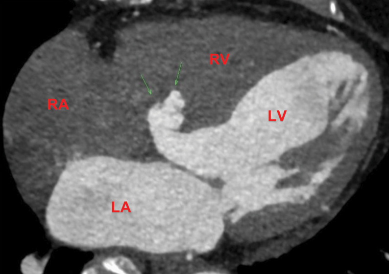 图2. 心脏CTA显示室间隔膨出瘤(箭头所示)。