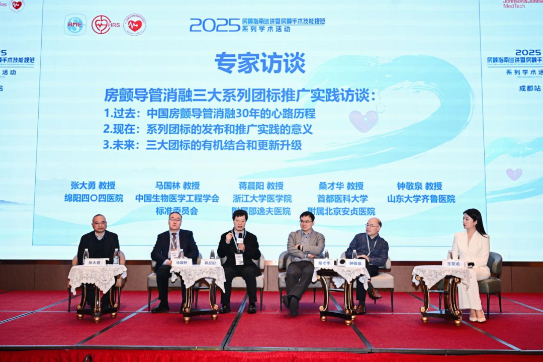 大会特设“房颤导管消融三大系列团标推广实践专家访谈”环节,邀请了学会标准委专家马国林教授,撰稿核心专家代表蒋晨阳教授、桑才华教授、钟敬泉教授,以及实践基地代表张大勇教授,围绕团标的历史意义、现实价值与未来演进展开深度对话。