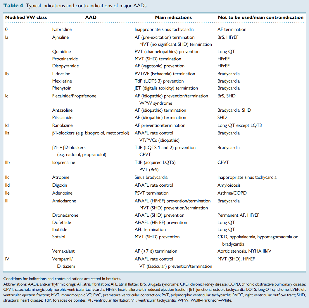 然而,在心室瘢痕或收缩功能不全的患者中应避免使用IC类药物和CCB,在NYHA心功能III–IV级心力衰竭患者中应避免使用索他洛尔和决奈达隆,因其存在致心律失常和/或血流动力学风险。