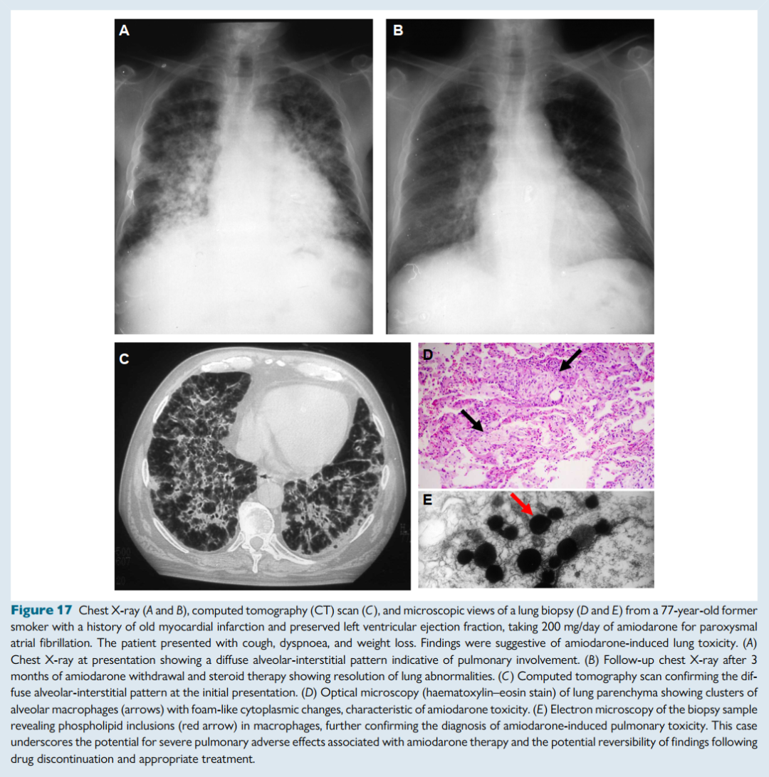 胺碘酮可引起角膜沉积物(>90%)、甲状腺疾病、肝脏病变和肺纤维化(1%–2%)。