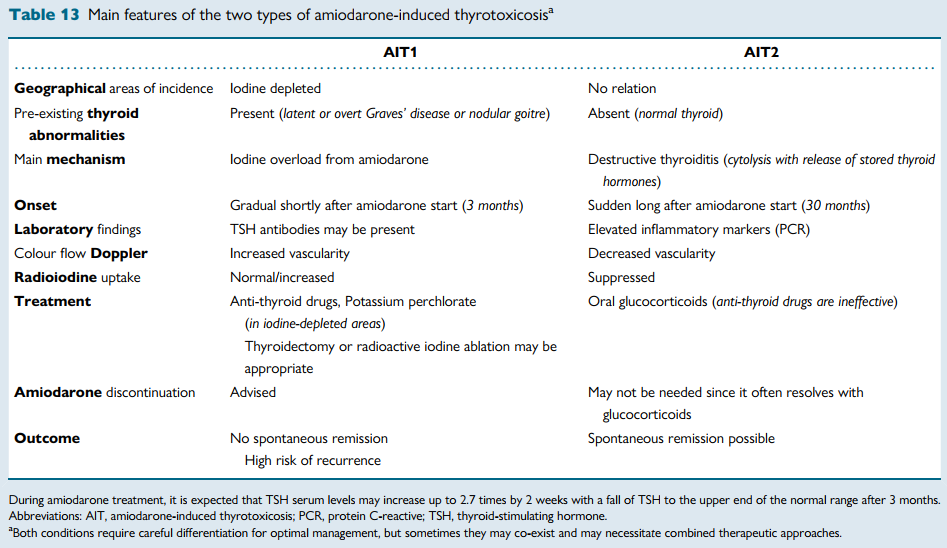 胺碘酮诱发的两种甲状腺毒症(AIT-1和AIT-2)在发病机制和治疗上有所不同。