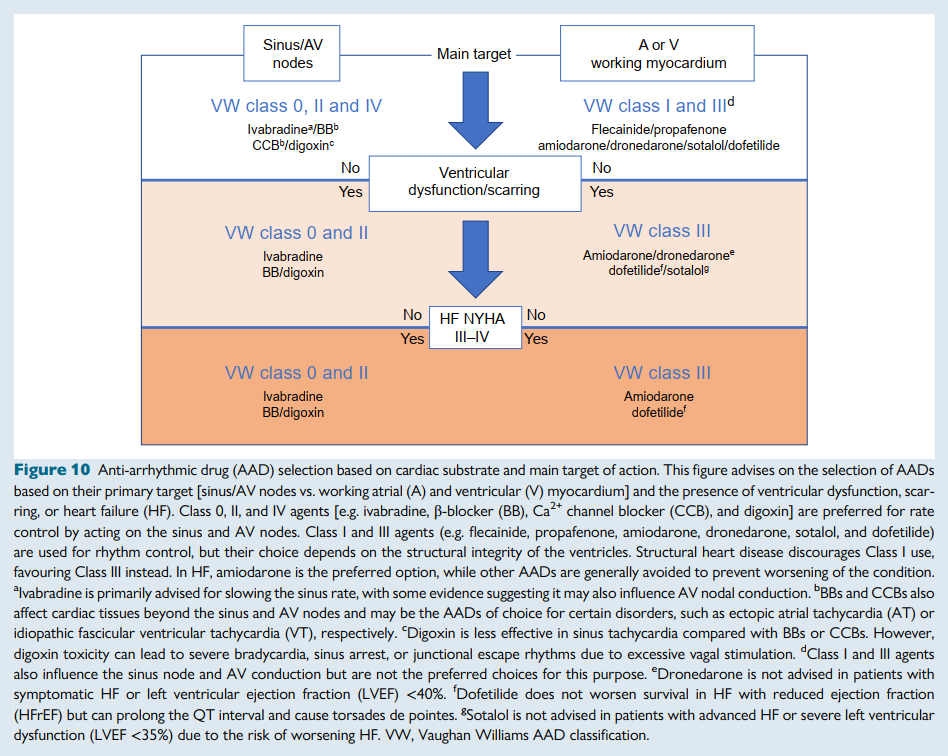 流程图帮助临床医生根据作用靶点(例如,窦房结/房室结与心房心肌/心室心肌)、是否存在结构性心脏病和心功能分级来确定药物选择。例如,当窦房结和房室结是主要目标时,首选伊伐布雷定、地高辛、CCB和β受体阻滞剂;而对于心肌性心律失常,通常首选I类和III类药物。
