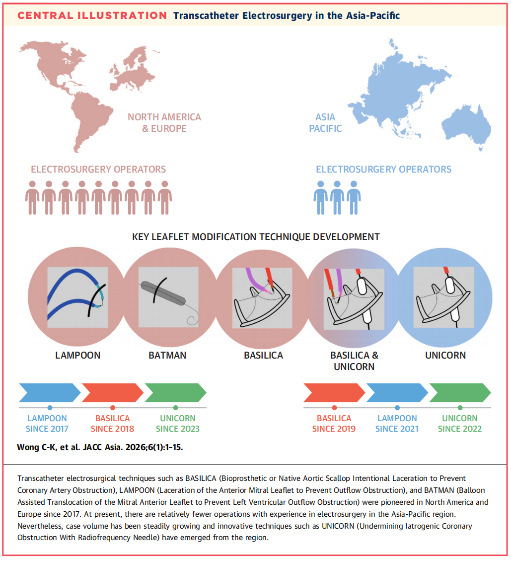 在亚太地区,经导管电外科技术具有特殊的应用价值。该地区主动脉根部细小的患者占比更高,导致自体瓣膜经导管主动脉瓣置换术(TAVR)和瓣中瓣TAVR的冠状动脉阻塞风险均有所上升。双侧冠状动脉均存在阻塞风险的病例也并不少见,这类情况通常需要对双侧瓣叶进行改良。同时,亚洲患者的左心室腔容积往往更小,部分患者在接受经导管二尖瓣置换术(TMVR)后,左心室流出道(LVOT)梗阻的风险可能会因此升高,因此在瓣膜植入前需要对二尖瓣前叶(AMVL)进行改良。然而,亚太地区在推广经导管电外科技术时面临诸多挑战,如具备丰富经验、能够提供带教指导的术者数量相对有限,且部分经导管电外科专用器械在该地区难以获取。为克服独特的解剖学挑战和资源限制,亚太地区涌现出了射频针松解医源性冠状动脉阻塞术(UNICORN)等一系列创新方案。