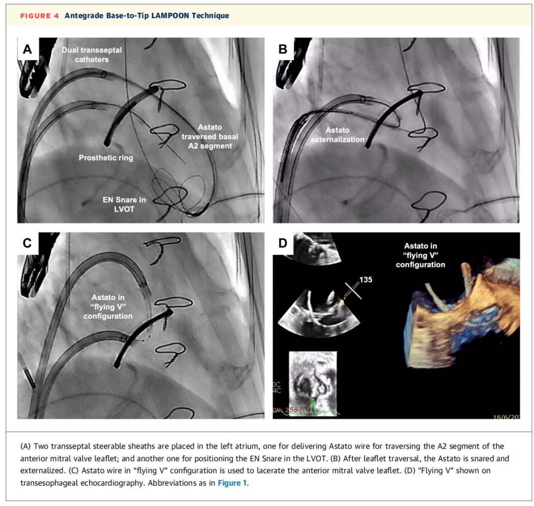 “顺行从基底部到瓣叶尖端”LAMPOON术是一种纯经房间隔顺行技术,简化了传统LAMPOON术的操作流程。手术时,在左心房内放置两根经房间隔可控鞘管:一根用于输送Astato导丝穿刺二尖瓣前叶,另一根则带有JL3.5导引导管,置于LVOT内并配备EN圈套器以捕获穿刺后的导丝。通过心房侧牵拉导丝,即可完成二尖瓣前叶的切开。