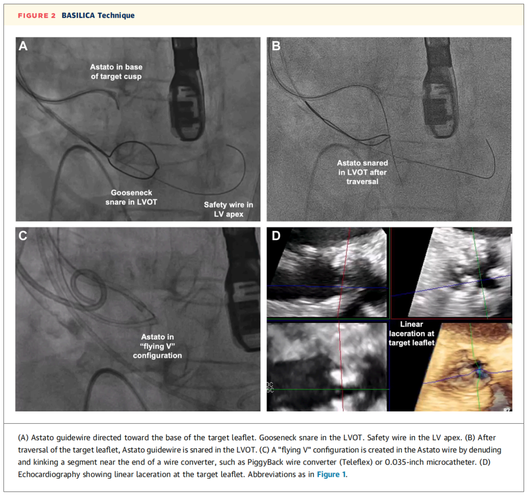 BASILICA术是一种通过经导管电外科切开主动脉瓣叶以降低冠状动脉阻塞风险的手术方式。手术时,先将LVOT导管穿过主动脉瓣,在瓣下位置放置圈套器,并在左心室内植入一根0.018英寸导丝作为锚点。同时,将装有0.014英寸Astato XS 20导丝的主动脉导管——导丝需装载在诸如PiggyBack导丝转换器或0.035英寸微导管等导丝连接器中——在经食管超声心动图和透视引导下对准目标瓣叶根部。