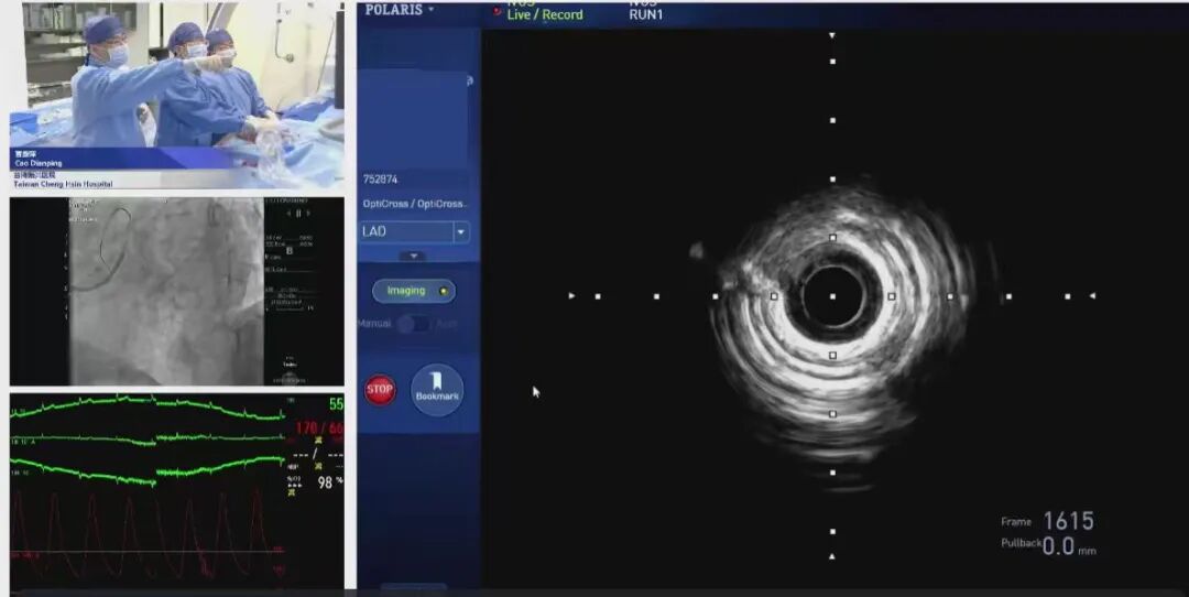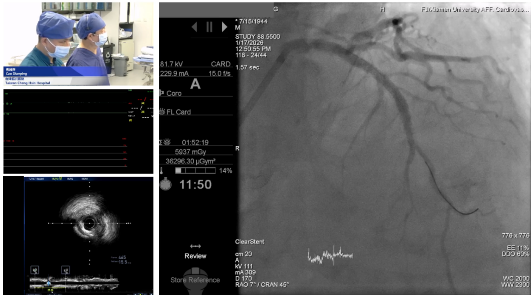 随后,台湾振兴医院曹殿萍教授团队协同厦门大学附属心血管病医院手术团队带来一例严重钙化病变的治疗策略演示。患者为81岁男性,因胸痛半年、近一周加重就诊,既往合并长期高血压、慢性肾病并长期透析及脑梗死病史。急诊冠脉造影显示前降支开口重度狭窄合并中段弥漫狭窄,伴多发重度钙化;回旋支近段中度狭窄;右冠第一转折处严重钙化。患者急诊阶段已置入IABP支持,并通过旋磨成功完成右冠钙化病变的支架治疗,本次手术重点处理前降支严重钙化病变。术者操作工作导丝行走至LAD远端后推送微导管跟进,并借助延长导管增强支撑力完成旋磨导丝交换,随后应用偏心旋磨逐渐提速、缓慢分段方式,对前降支开口至中段的严重弥漫钙化组织进行了充分预处理,随后依据IVUS影像提示,主动运用Rota-Tripsy策略,采用冲击波球囊进一步修饰钙化,最终依据病变情况选择近中段串联植入支架、远端药物球囊完成治疗。该病例充分展示了腔内影像技术对钙化病变的充分评估及Rota-Tripsy策略下对弥漫性严重钙化病变的有效修饰,实现精准介入诊疗。