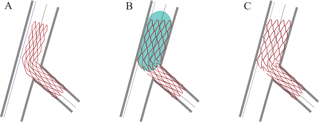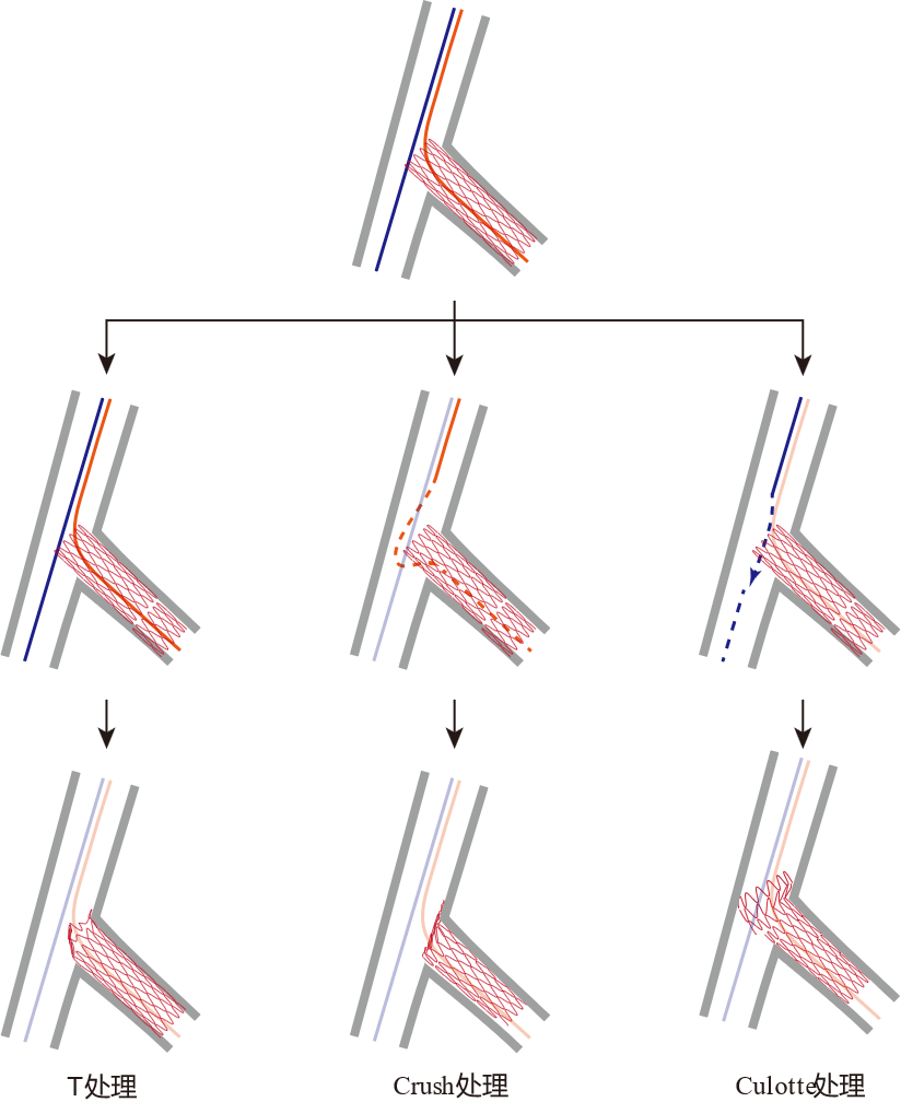 突出到主支内的支架需要加以挤压贴壁,根据挤压方式,可以分为T处理(冗余支架梁挤压于血管脊部位)、Crush处理(冗余支架梁挤压于分支开口四周血管壁)和Culotte处理(冗余支架梁挤压于主支四周血管壁)(图12),方法学类似于双支架技术时对分支支架的处理方式。