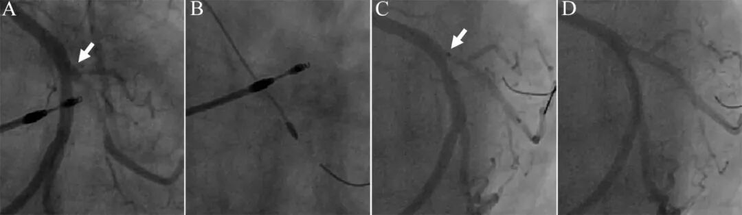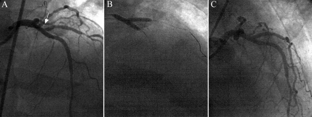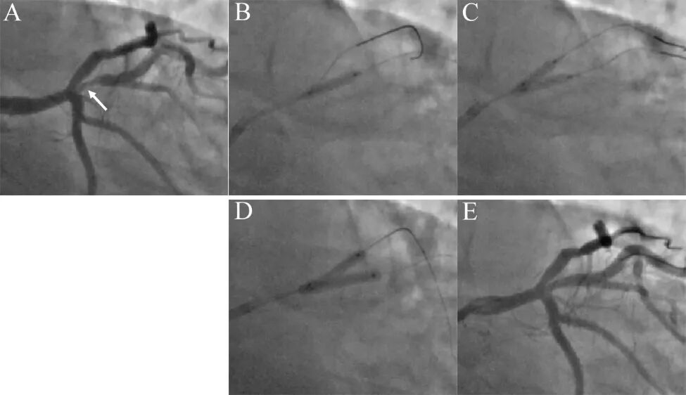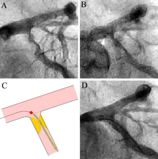 图10 支架回拉法处理对角支开口病变[10]。