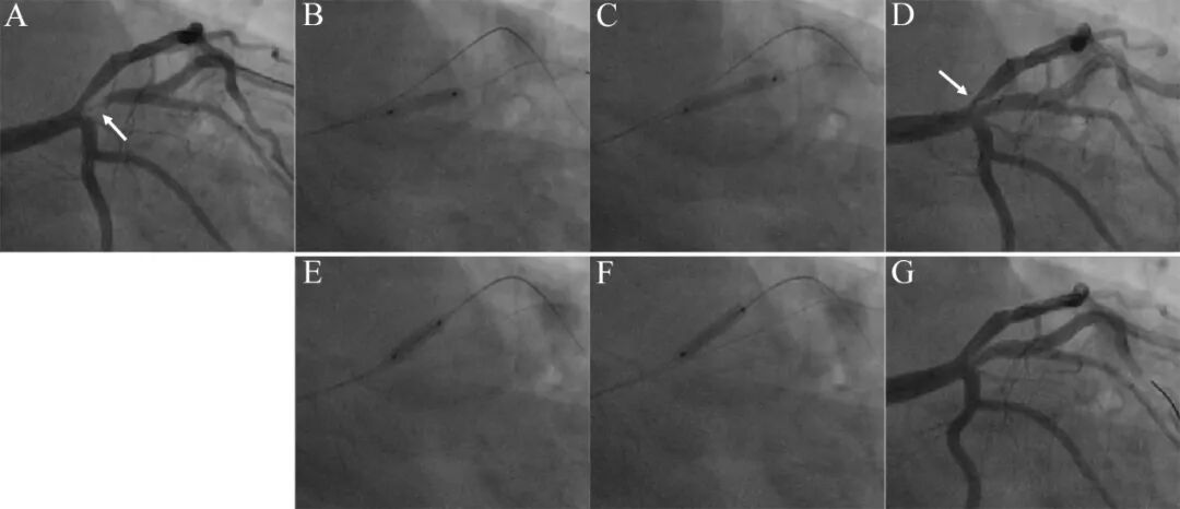 55岁吸烟男性,劳力性心绞痛1个月。造影示前降支近段狭窄40%,粗大中间支开口狭窄95%(A)。2.5mm×15mm半顺应性球囊和2.75×10mm切割球囊预处理病变(B),最后2.75×15mm药物球囊10atm×45秒扩张中间支开口病变(C),中间支残余狭窄<50%,但前降支开口狭窄加重(D)。同样流程处理前降支开口病变,先后以2.5×15mm半顺应性球囊、2.75×10mm切割球囊(E)、2.75×15mm药物球囊扩张前降支开口病变(F),造影结果良好(G)。IVUS检查前降支开口和中间支最小管腔面积(MLA)分别为5 mm² 和 4.81 mm²。