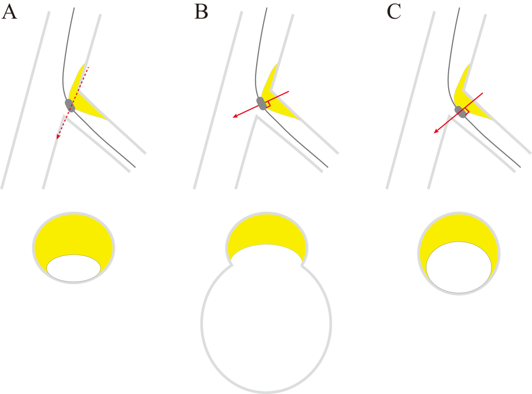A 不可能的成像“横”切面;B 开口部成像“斜”切面;C 近端成像“斜”切面