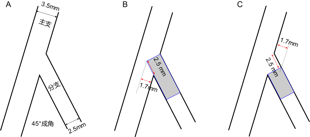 假设分叉成角45°角,主支内径3.5mm,分支内径2.5mm。若支架齐平分支开口上缘,主支内支架冗余1.7mm;若支架齐平分支开口下缘,分支开口支架缺失缺失2.5mm。