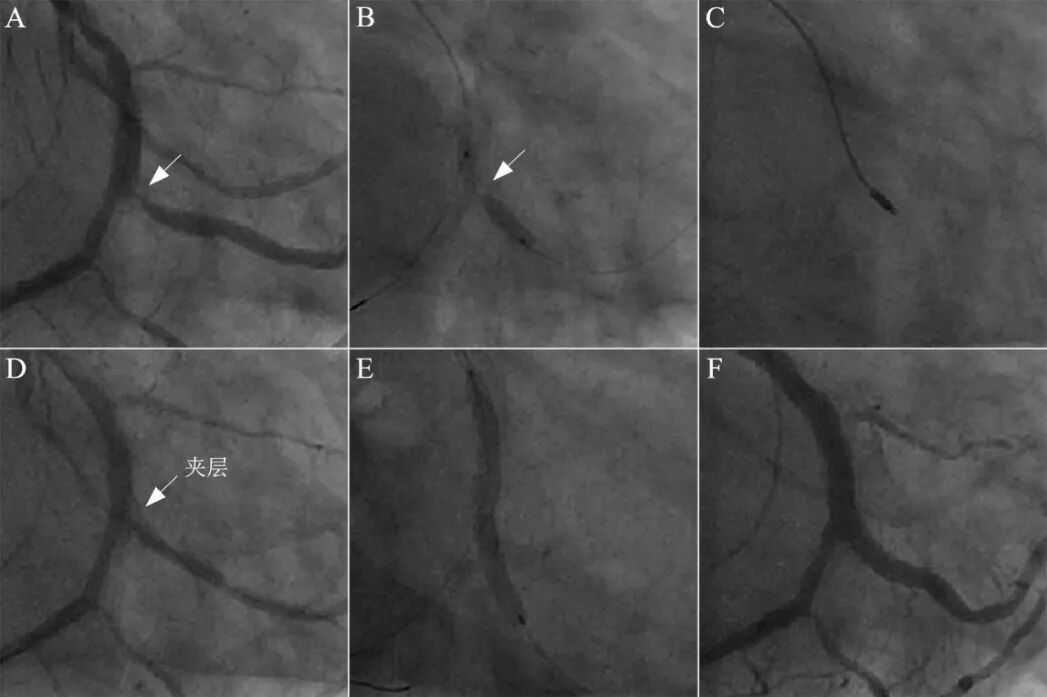钝缘支开口钙化性狭窄95%(A),球囊16atm膨胀不全(B),启动旋磨治疗,1.25mm磨头尝试3次后顺利通过(C),球囊扩张后可见明显夹层形成(D)。鉴于钝缘支粗大,直接跨越法置入支架(E),结果良好(F)。