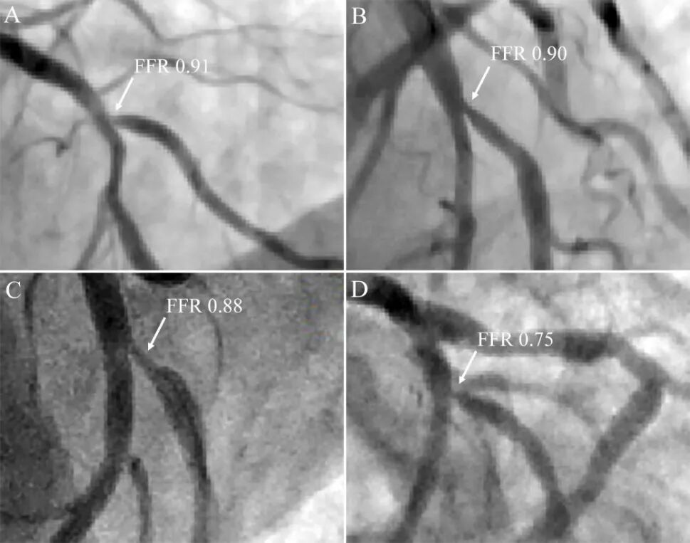 (2)缺血:缺血金标准是FFR等功能学评价,冠脉造影和腔内影像只能反映狭窄程度的解剖学改变(图2)。Koo研究[5]支架后分支开口受累情况,若造影<75% ,FFR均无意义;若造影 ≥75%,只有27%(20/73例)FFR有意义。