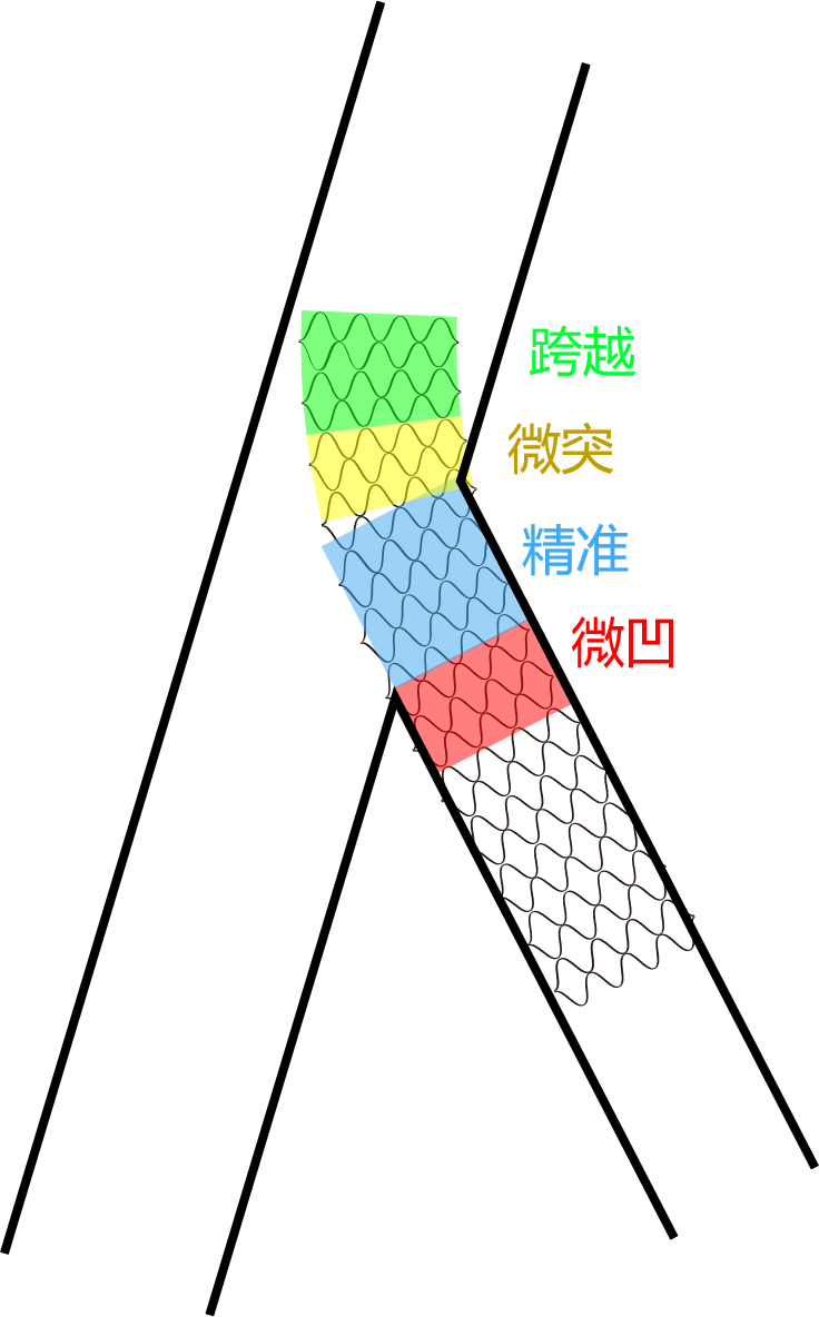 蓝色区域为精确定位,支架“冗余+缺失”总值最小化;黄色区域为微突法,支架冗余过多;绿色区域为跨越法(crossover),支架跨越至主干;红色区域为微凹法,缺失过多。